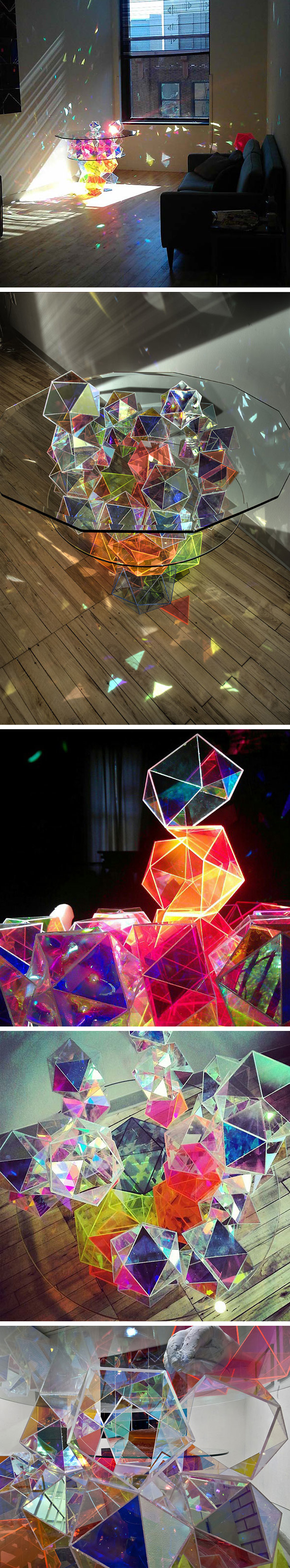 Enorme coup de coeur pour le travail du design originaire de Minneapolis (USA) John Foster. Celui-ci a conçu une table dont la base est constituée d’une multitude de cristaux colorés se reflétant sur les murs. Entre meuble et sculpture, la Sparkle Palace Cocktail Table apparait comme un objet unique mais pas à portée de toutes les bourses (6 910 $). Sparkle Palace Cocktail Table